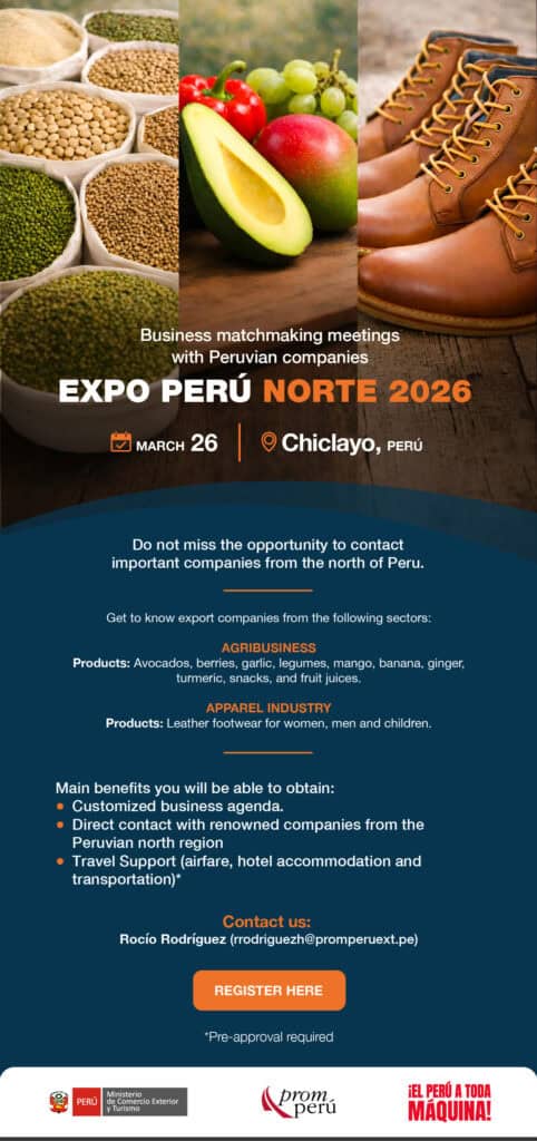 Das Handelsbüro von Peru in Deutschland lädt Sie zu einem Wirtschaftstreffen in die peruanische Stadt Chiclayo ein, das vom 25. – 26. März stattfindet und an dem 70 peruanische Unternehmen aus den Bereichen Lebensmittel aus dem Norden Perus. Es handelt sich um eine spezialisierte B2B-Veranstaltung zur direkten Kontaktaufnahme mit peruanischen Lieferanten aus der nördlichen Region Perus. Wenn Sie auf der Suche nach den folgenden Produktgruppen sind, können Sie sich anmelden oder uns kontaktieren: